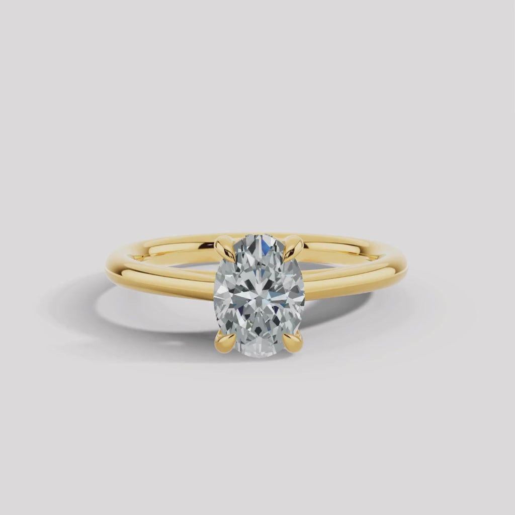 This exquisite hidden under halo engagement ring is a testament to refined elegance, showcasing a brilliant central oval cut diamond that is meticulously cut to radiate an enchanting sparkle. The centrepiece is adorned by an equally radiant round cut melee diamonds that create a hidden under halo, each set in a delicate balance that exemplifies harmony. Made with warm tone of yellow gold to perfectly complement your unique love story.