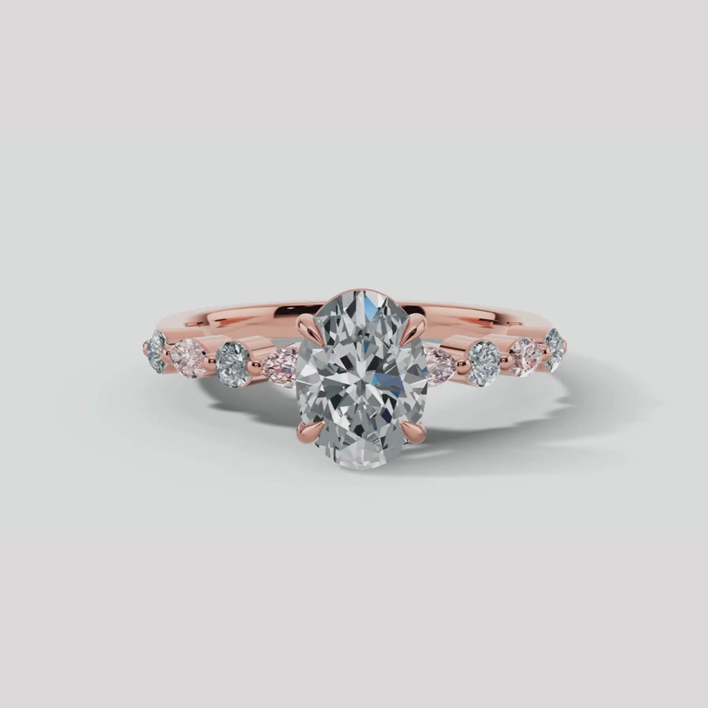 This exquisite engagement ring is a testament to refined elegance, showcasing a brilliant central oval cut diamond that is meticulously cut to radiate an enchanting sparkle. The centrepiece sits on a stunning rose gold band with station set pink and white diamonds. Marquise cut and round cut diamonds on each side, smaller yet equally radiant, set in a delicate balance that exemplifies harmony.