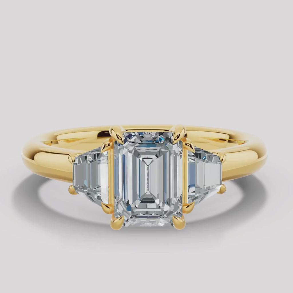 This exquisite trilogy engagement ring is a testament to refined elegance, showcasing a brilliant central emerald cut diamond that is meticulously cut to radiate an enchanting sparkle. The centrepiece is flanked by smaller yet equally radiant tapered cut diamonds on each side, each set in a delicate balance that exemplifies harmony. Made with warm tones of yellow gold to perfectly complement your unique love story.