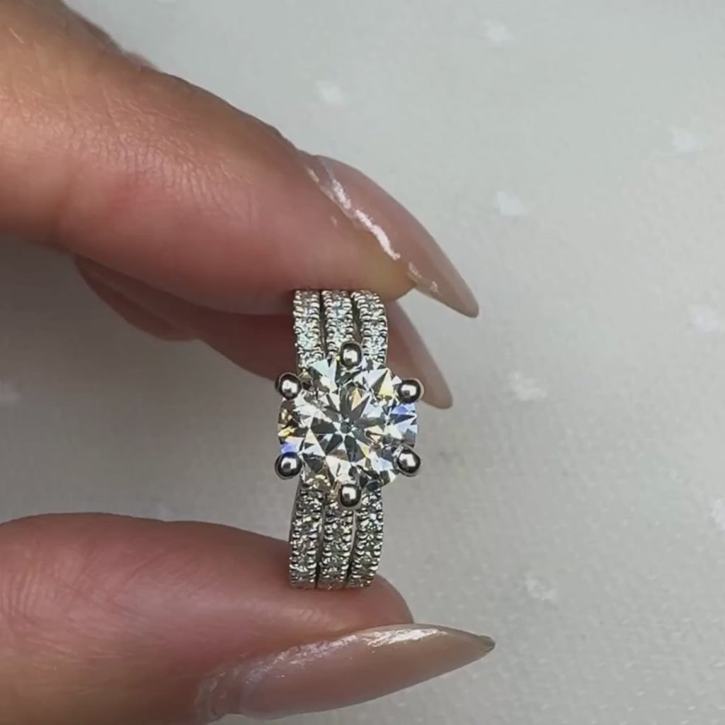 Gracefully tapering from the center are delicately set shoulder diamonds, each one precisely chosen to enhance the radiance of the centerpiece. Their subtle brilliance adds depth and fluidity, creating a graceful arc of light across the finger.