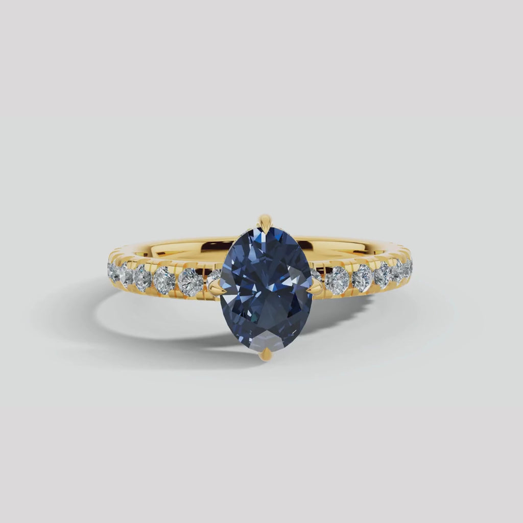This exquisite ring is a celebration of sophistication and timeless elegance. Showcasing a breathtaking 4-carat oval-cut blue sapphire as its centerpiece, the vivid deep blue hue exudes regality and charm.