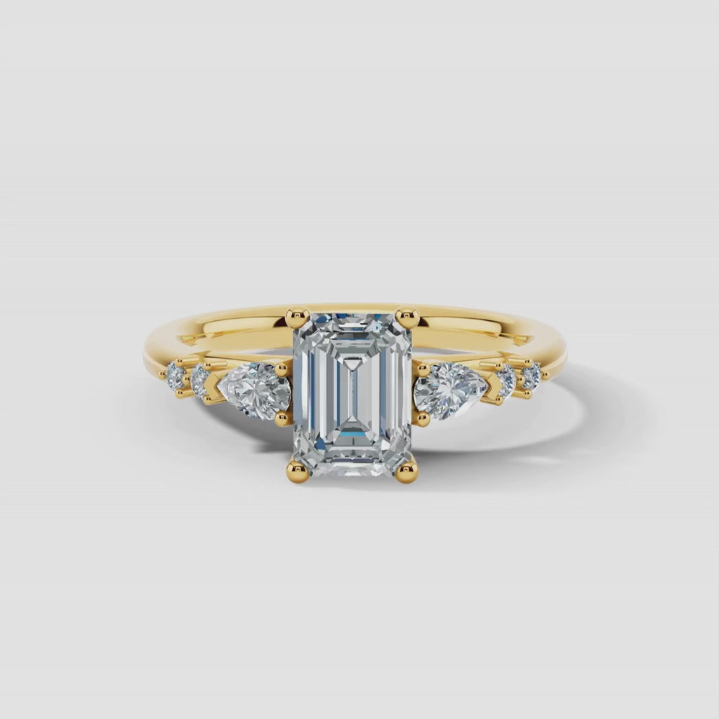 This remarkable ring features a striking 3-carat emerald-cut diamond at its heart, exuding refined elegance. Framing the center stone, pear-shaped diamonds add a graceful touch, while beneath them, two round-cut diamonds on each side create a mesmerizing tiered effect. Set in a rich 18k yellow gold band, this design seamlessly blends brilliance with sophistication.