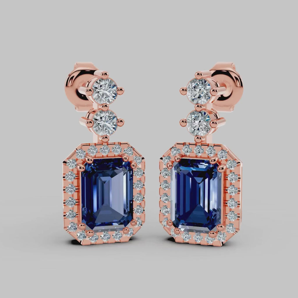 Elevate your elegance with our stunning lab grown 1 carat sapphire drop stud earrings. Emerald cut sapphire, surrounded with alluring halo. Crafted with precision, these earrings seamlessly blend classic sophistication with modern allure. The stud design ensures secure wear, allowing you to dazzle all day and night.