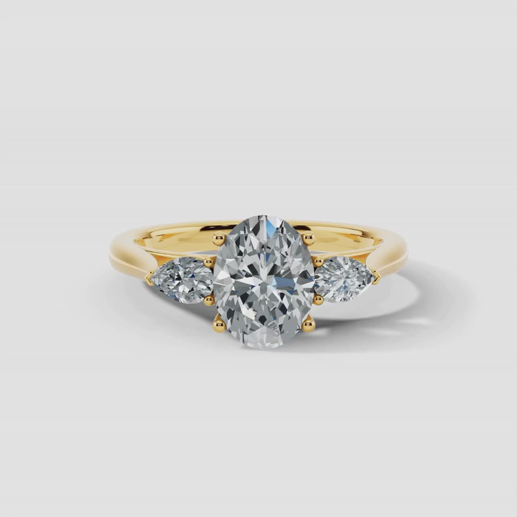This exquisite creation is a perfect blend of classic sophistication and modern allure. Showcasing a breathtaking oval center diamond, the centerpiece is elegantly flanked by two pear-shaped diamonds set in tiger claw prongs, creating a dynamic and captivating silhouette.