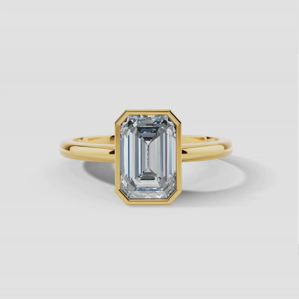 This stunning ring showcases a striking 5-carat emerald-cut diamond as its centerpiece, exuding timeless sophistication and unmatched brilliance. The diamond is gracefully embraced by an 18k yellow gold bezel setting, which enhances its clean lines and geometric elegance while offering superior protection. The warm tones of the yellow gold band beautifully complement the diamond’s clarity, creating a harmonious and luxurious design.
