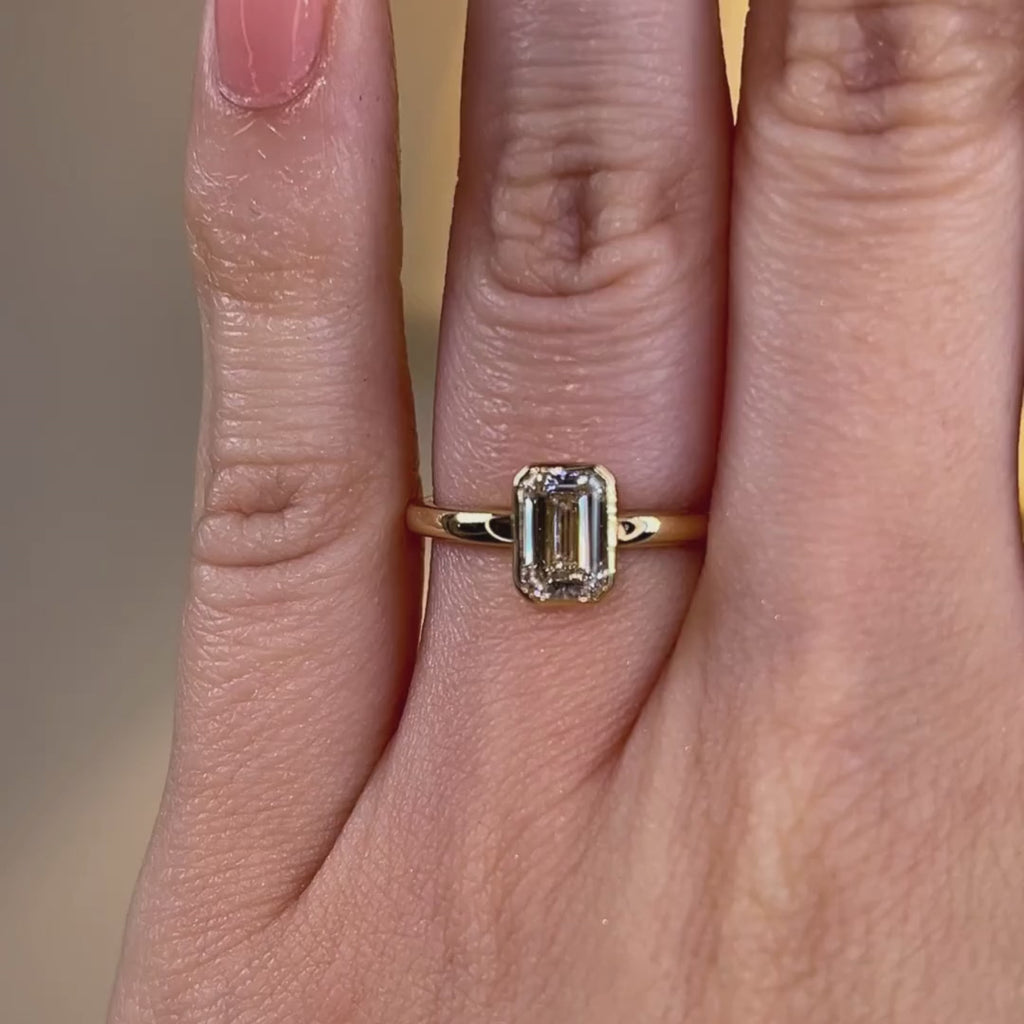 This stunning ring showcases a striking 5-carat emerald-cut diamond as its centerpiece, exuding timeless sophistication and unmatched brilliance. The diamond is gracefully embraced by an 18k yellow gold bezel setting, which enhances its clean lines and geometric elegance while offering superior protection. The warm tones of the yellow gold band beautifully complement the diamond’s clarity, creating a harmonious and luxurious design.
