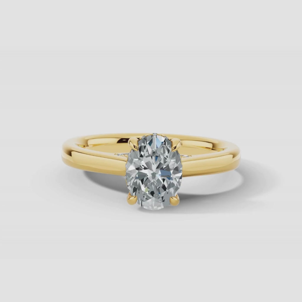 This exquisite engagement ring is a testament to refined elegance, showcasing a brilliant oval cut diamond that is meticulously cut to radiate an enchanting sparkle. The centrepiece is adorned with a hidden under halo and row of micro set diamonds on ring band each set in a delicate balance that exemplifies harmony.