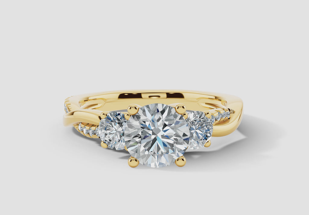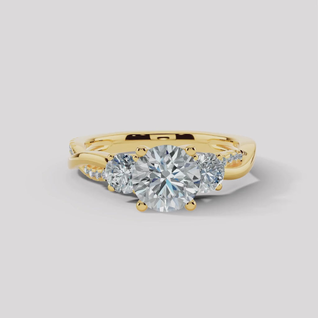 A brilliant 2-carat round-cut diamond takes center stage in this captivating trilogy ring, symbolizing the past, present, and future. On either side, round-cut diamonds enhance its radiant sparkle, while the twisted diamond shoulders add a touch of fluid elegance.