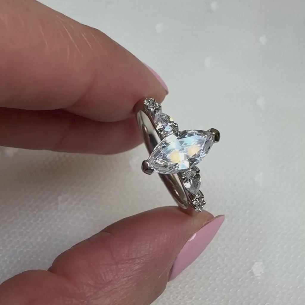 Side Stones: One small marquise and two round diamonds on each side, arranged for a soft, graceful flourish.