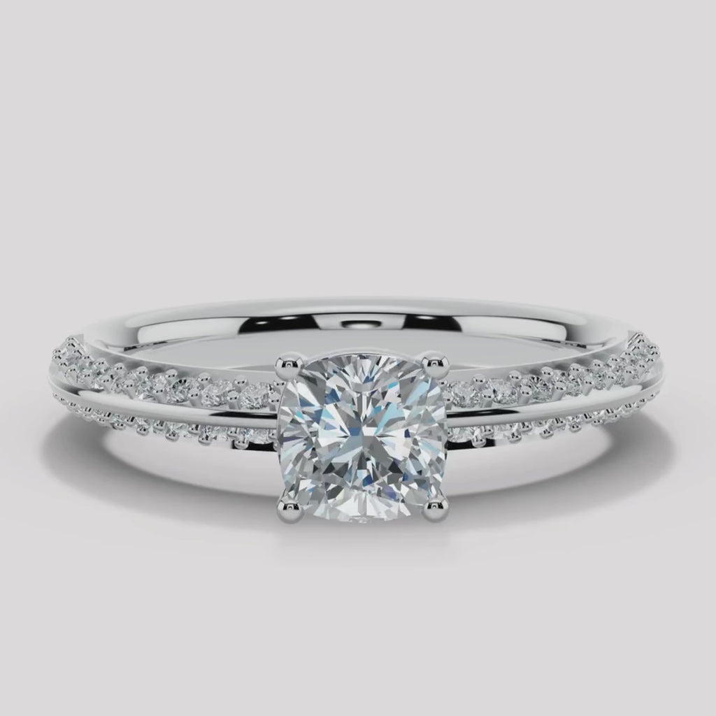 This exquisite engagement ring is a testament to refined elegance, showcasing a cushion cut diamond with double row diamond pave shoulders that is meticulously cut to radiate an enchanting sparkle. Choose from the timeless elegance of white gold, the warm tones of yellow and rose gold, or the enduring strength of platinum to perfectly complement your unique love story.
