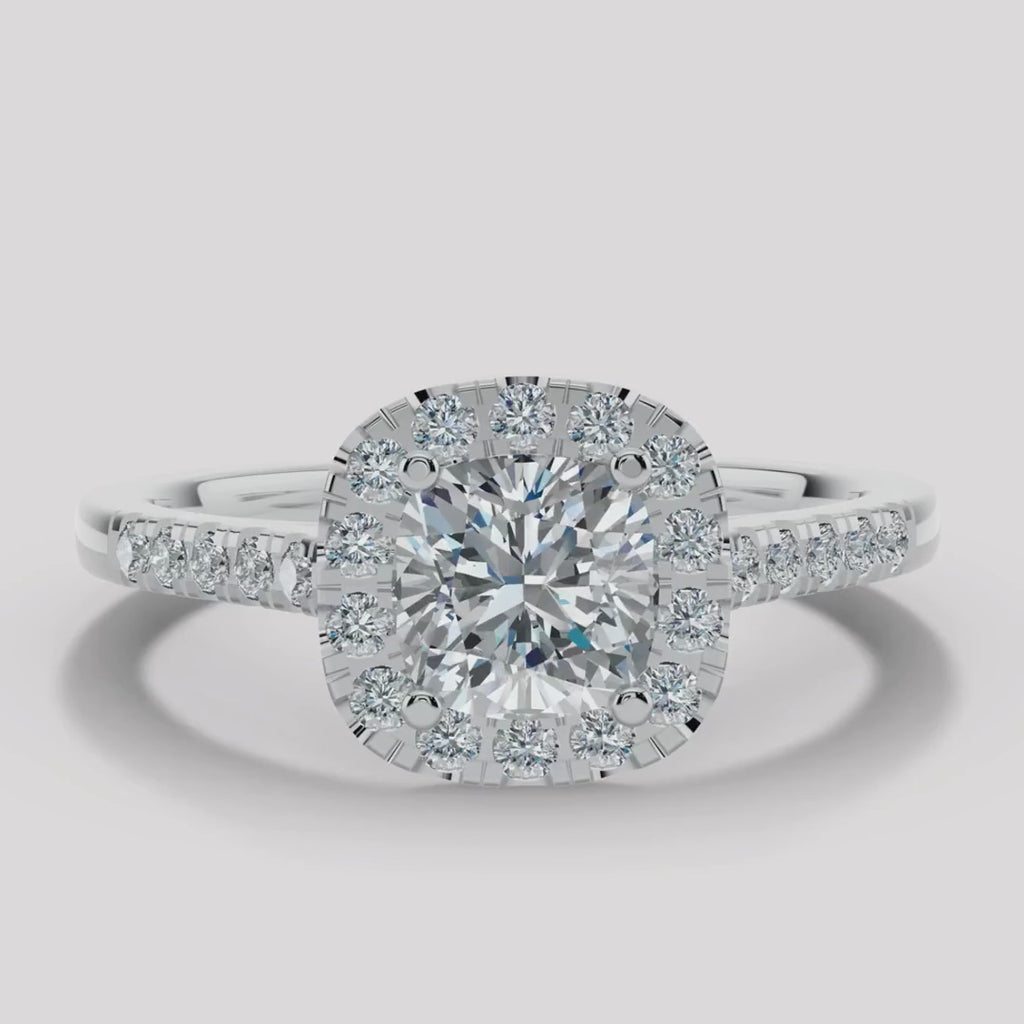 This exquisite halo engagement ring is a testament to refined elegance, showcasing a cushion cut centre diamond with halo shape and diamond shoulders meticulously cut to radiate an enchanting sparkle. Choose from the timeless elegance of white gold, the warm tones of yellow and rose gold, or the enduring strength of platinum to perfectly complement your unique love story.