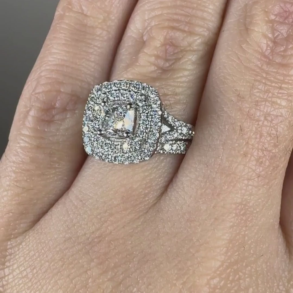 This dazzling set features a 2-carat cushion-cut diamond at its center, surrounded by a double halo of round diamonds that enhance its brilliance and presence. The diamond-adorned shoulders add extra sparkle, perfectly complementing the luxurious design.