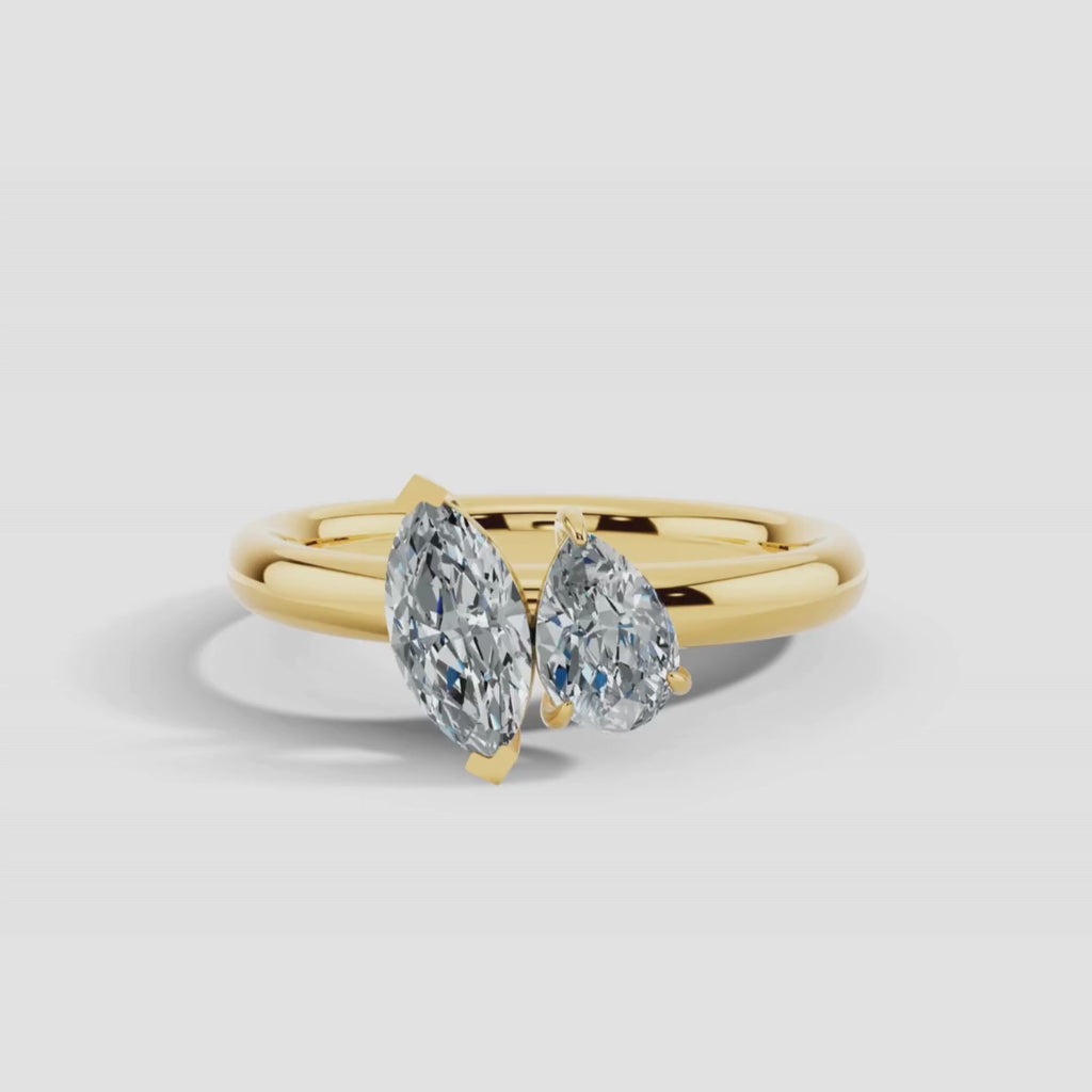 Two souls. One story. This captivating Toi et Moi yellow gold engagement ring pairs a pear-cut and a marquise-cut diamond—each weighing 1 carat—to represent the beautiful duality of love. Side by side in perfect harmony, the unique shapes reflect the individuality of two hearts united as one.