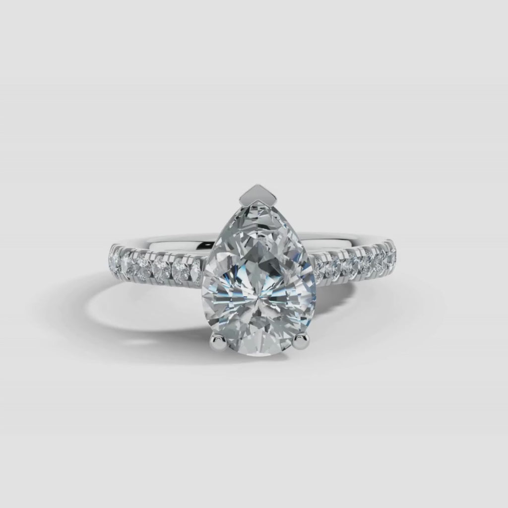 This exquisite engagement ring is a testament to refined elegance, showcasing a pear cut diamond with grain set diamond shoulders that is meticulously cut to radiate an enchanting sparkle. Choose from the timeless elegance of white gold, the warm tones of yellow and rose gold, or the enduring strength of platinum to perfectly complement your unique love story.