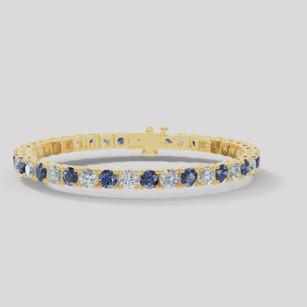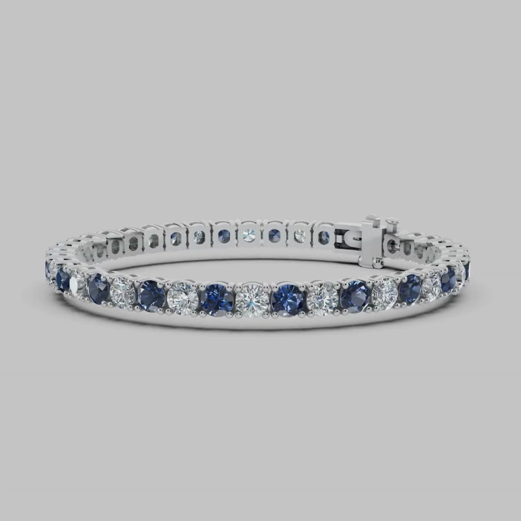 Elevate your wrist game with our exquisite diamond and sapphire tennis bracelet—a true embodiment of modern luxury. Crafted with precision, this bracelet seamlessly blends timeless design with eco-conscious materials. Available in white gold, yellow gold, rose gold as well as platinum. Choose between lab grown or natural diamonds, each reflecting brilliance and ethical elegance.