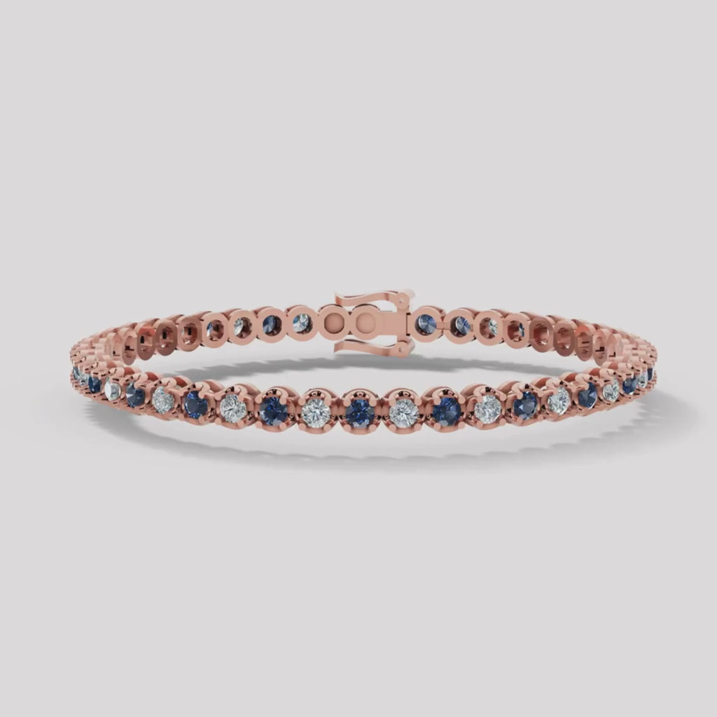 Elevate your wrist game with our exquisite diamond and sapphire bracelet—a true embodiment of modern luxury. Crafted with precision, this bracelet seamlessly blends timeless design with eco-conscious materials. Available in white gold, yellow gold, rose gold as well as platinum. Choose between lab grown or natural diamonds, each reflecting brilliance and ethical elegance.