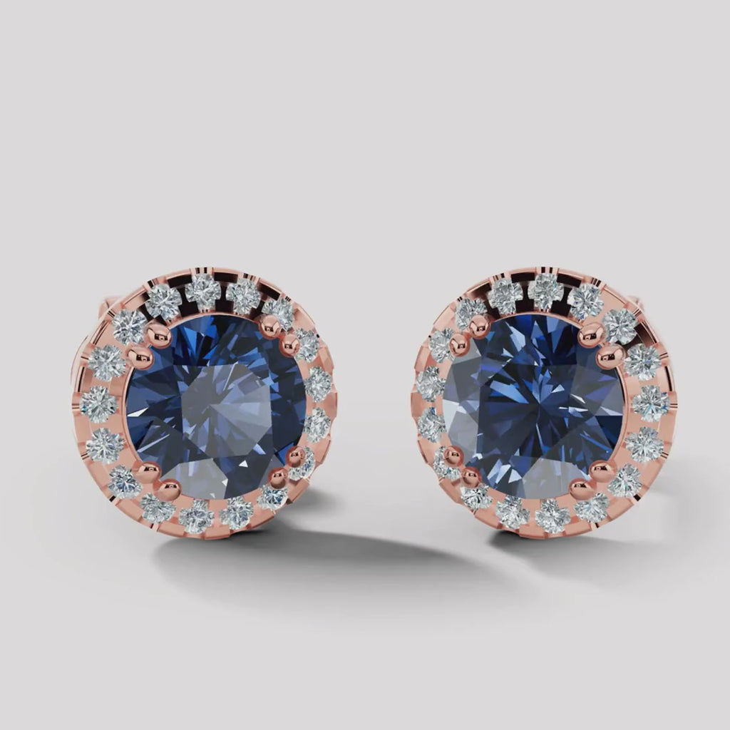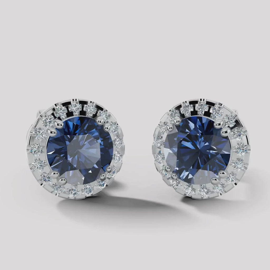 Discover elegance with our Round Sapphire and Diamond Halo stud earrings. These refined studs feature captivating Sapphire centre stones encompassed by a glittering diamond halo. Customise your stud earrings by choosing your preferred metal setting. Available in White Gold, Yellow Gold, Rose Gold, or Platinum. Choose between Lab-Grown or Natural Diamonds.