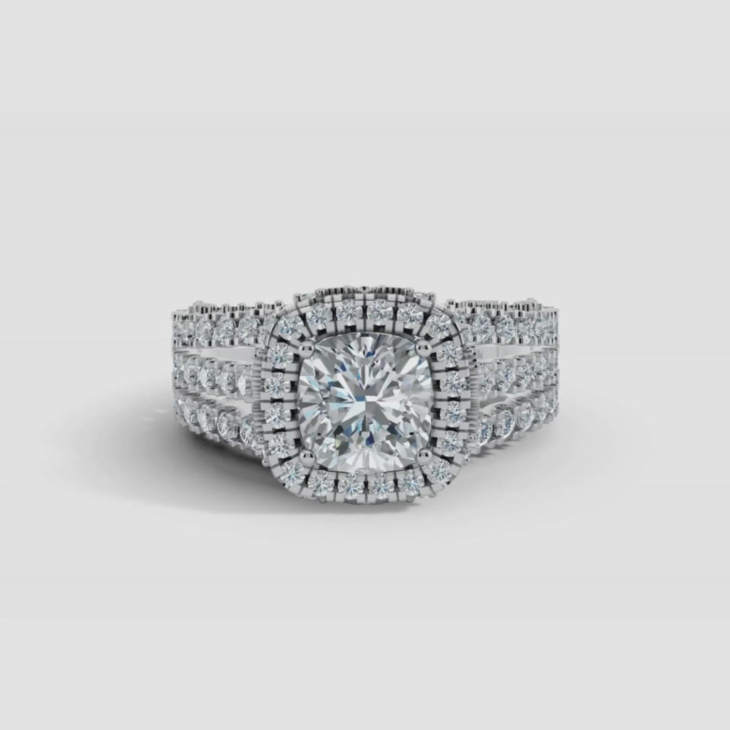 This exquisite halo engagement ring is a testament to refined elegance, showcasing a brilliant central cushion cut diamond that is meticulously cut to radiate an enchanting sparkle. The diamond is surrounded by a beautiful halo of melee diamonds creating a perfect balance that exemplifies harmony.
