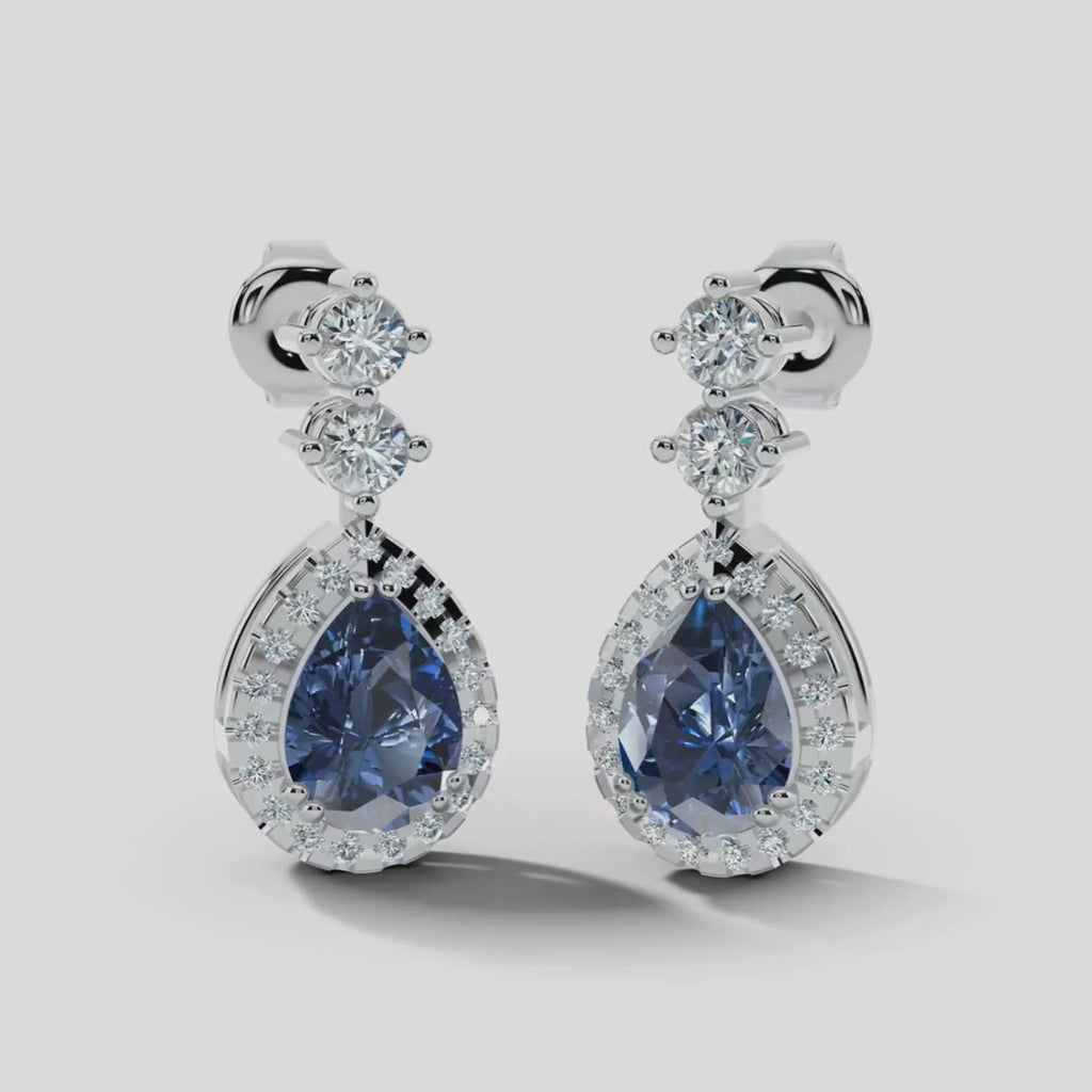 Elevate your elegance with our stunning 1.40 carat sapphire drop stud earrings. Centre stone is pear cut sapphire surrounded with alluring halo. Crafted with precision, these earrings seamlessly blend classic sophistication with modern allure. The stud design ensures secure wear, allowing you to dazzle all day and night.