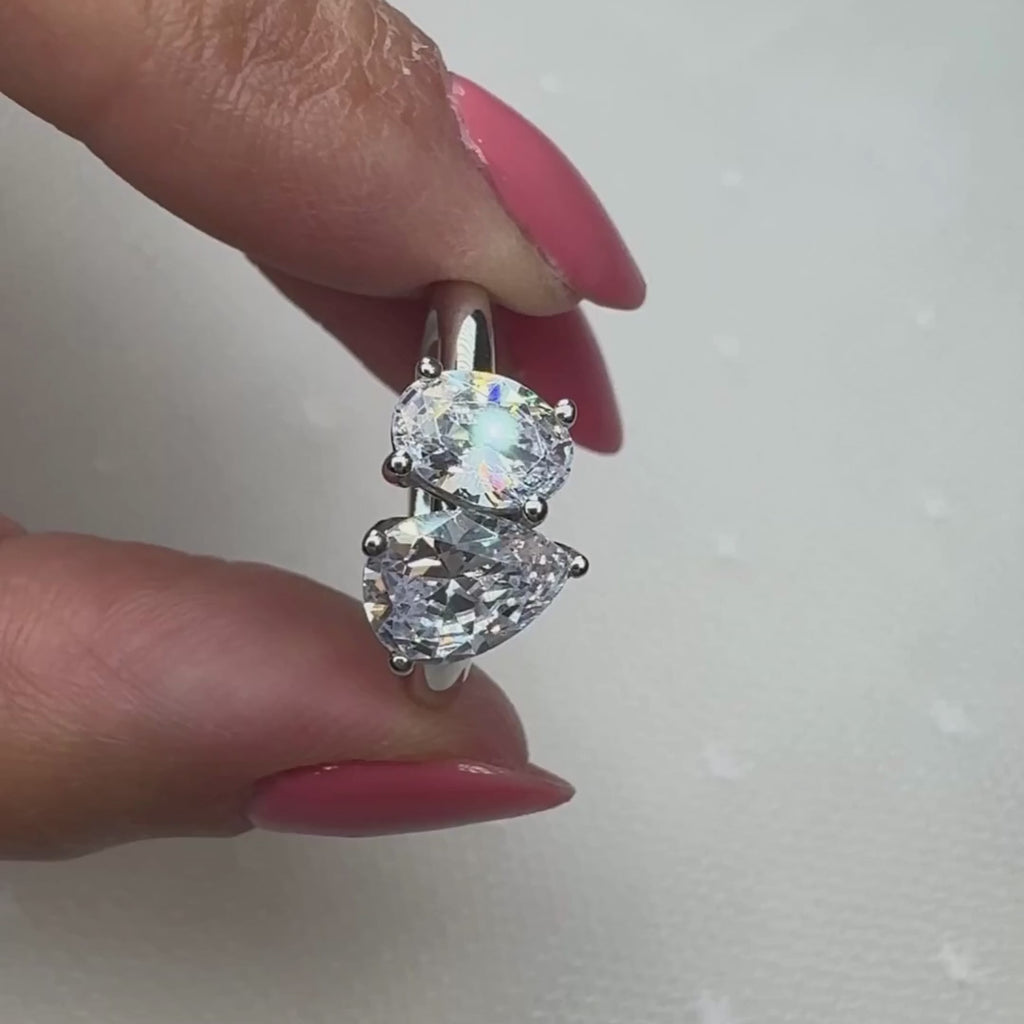 Sculpted in premium platinum, the bypass-style setting cradles both stones in perfect balance, creating a fluid silhouette that wraps the finger in light and meaning. The pear-cut diamond offers a teardrop of brilliance, while the oval-cut diamond brings an elongated sparkle that complements with graceful elegance.