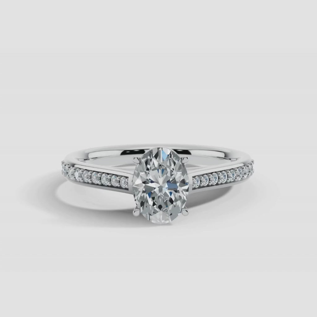 This exquisite engagement ring is a testament to refined elegance, showcasing an oval cut diamond with channel set diamond shoulders that is meticulously cut to radiate an enchanting sparkle. Choose from the timeless elegance of white gold, the warm tones of yellow and rose gold, or the enduring strength of platinum to perfectly complement your unique love story.